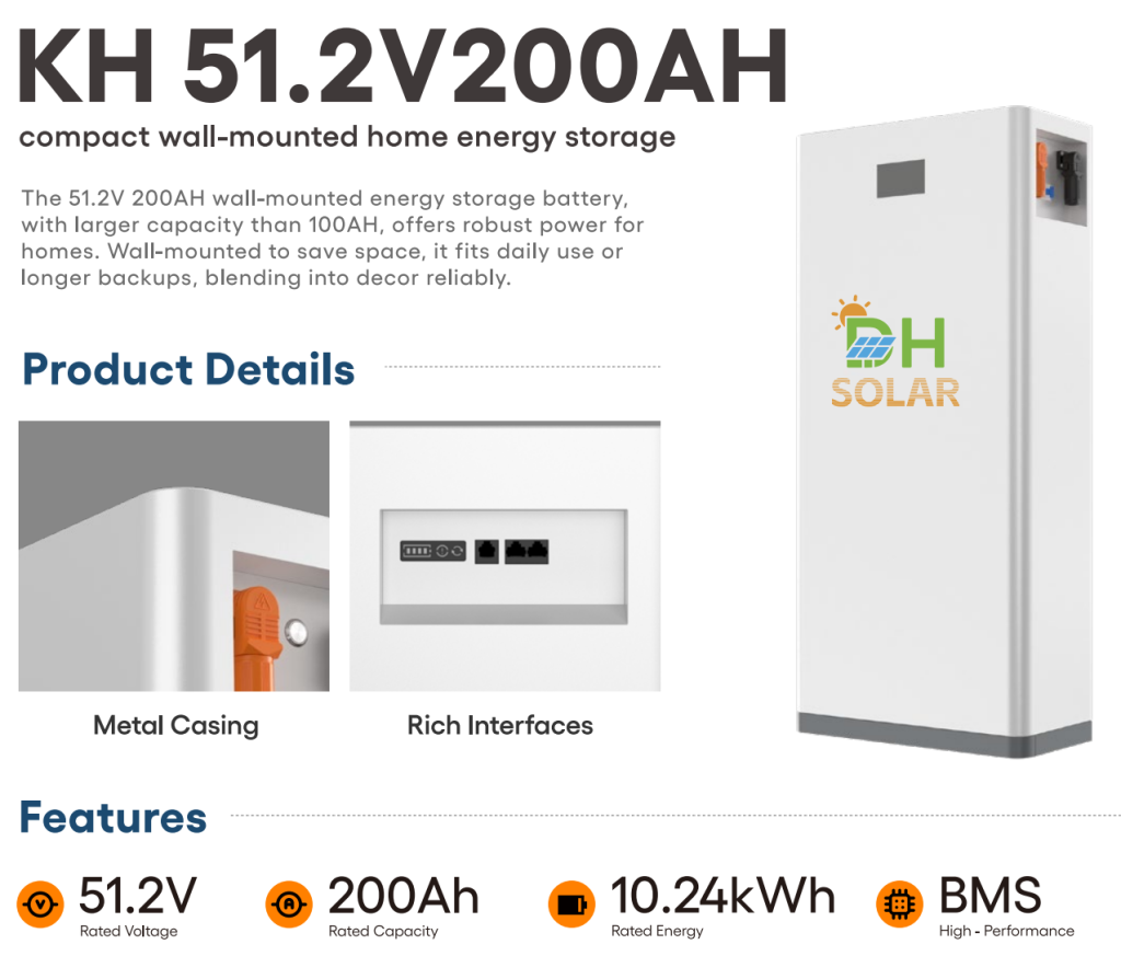 The 51.2V 200AH wall-mounted energy storage battery,with larger capacity than 100AH,offers robust power forhomes.Wall-mounted to save space,it fits daily use orlonger backups,blending into decor reliably.