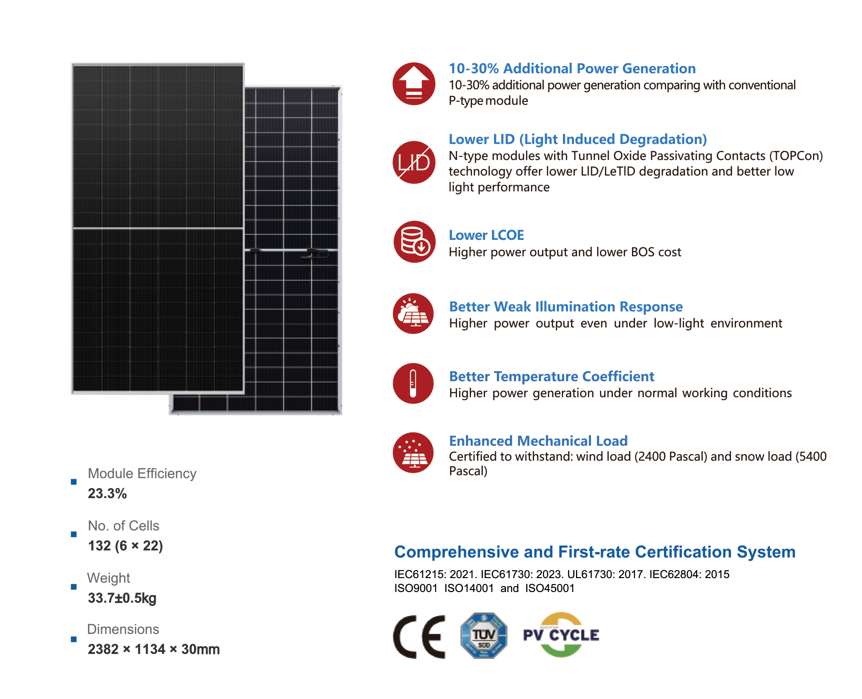 TOPCON BIFACIAL N Type-66 16BB 610W~630W TOPCON BIFACIAL N Type-66 16BB610W / 615W / 620W / 625W / 630W High Efficiency Lower LID and TOPCon cell with Half-cut TechnologyBig Size : Cell 182 × 105mm Monocrystalline INQUIRY CONTACT US Please enable JavaScript in your browser to complete this form.Your Name *Your Email *Your Company *Your Message *WebsiteSend Message Product Details